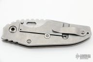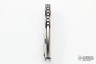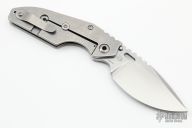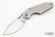 This XL Jibble by Mick Strider features a stonewashed blade with notched thumbrest and a thumbhole. The handle has a stonewashed titanium frame with tip up reversible clip. Nice detent, lockup and blade seating. New Condition.