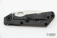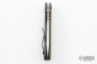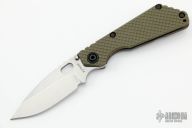 This SNG framelock folder by Mick Strider features a stonewashed blade and a dimple pattern green G-10 and flamed titanium frame and tip up titanium clip. Includes a "Lock Bar Stabilizer" for maximum reverse lock retention. Nice detent, lockup and blade seating. New condition.