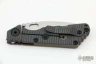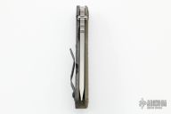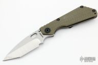 This SNG framelock folder by Mick Strider features a stonewashed blade and a dimple pattern green G-10 and flamed titanium frame and tip up titanium clip. Includes a "Lock Bar Stabilizer" for maximum reverse lock retention. Nice detent, lockup and blade seating. New condition.
