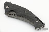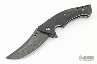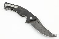 This Mamba flipper by Walter Brend is a Joel Pirela design features a stainless Damascus blade with notched thumbrest and flipper. Carbon Fiber scales, titanium liners, carbon fiber backspacer, and a tip up titanium clip dated 06/14. Smooth function with a nice lock, detent and blade seating dead center. Rides on bearings. Hidden lanyard pin at the butt. Comes with original box, velcro case and papers. Excellent condition. One of only 20.