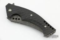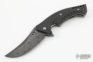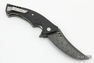 This Mamba flipper by Walter Brend is a Joel Pirela design features a stainless Damascus blade with notched thumbrest and flipper. Carbon Fiber scales, titanium liners, carbon fiber backspacer, and a tip up titanium clip dated 06/14. Smooth function with a nice lock, detent and blade seating dead center. Rides on bearings. Hidden lanyard pin at the butt. Comes with original box, velcro case and papers. Excellent condition. One of only 20.