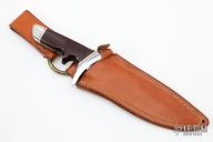 This "SAS" Combat Knife by Rod Chappel (Davis Knives) features a mirror polished blade with a sharpened top edge, .255" blade stock and 1.972" blade depth, hidden tang construction. The handle has a stainless steel guard and butt, maroon linen micarta grip with black, aluminum, and brass spacers. Very nice figuring in the handle. Comes with a brown leather sheath. Has some scratches, otherwise excellent condition. Knife is dated May 30th 1984.