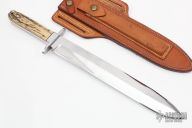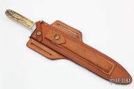 This knife by Walter Brend features a mirror polished blade with a false top edge and a full tang construction.  .296" Blade Stock.  1.593" Blade Depth.  The handle has a steel guard with stag scales and black liners.  Includes a brown leather sheath. Light oxidation is visible on the tang.  Scuffs/scratches are visible on the blade and handle otherwise the knife is in excellent condition given its age.