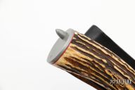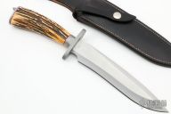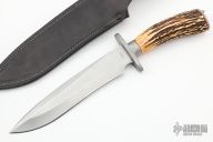 This Fighter by Harold Corby features a bead blasted blade with a sharpened top edge, .214" blade stock and 1.520" blade depth, hidden tang construction. The handle has a a bead blasted stainless steel guard and butt, stag grip, and red spacers. Comes with a black leather sheath. Excellent condition. #01
