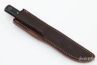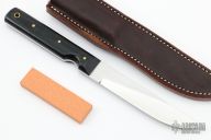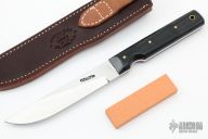 This Model 10 Salt Fisherman and Household Utility features a satin finish drop point blade with swedge and notched thumbrest, .134" blade stock and .899" blade depth. The handle is comprised of black linen micarta scales over full tang construction. Brass lanyard tube with lanyard in pommel. Includes a brown leather sheath and sharpening stone. Excellent condition. Comes with a zippered case.