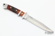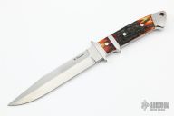 This Integral Sub-Hilt Fighter by Ricardo Velarde features a hand rub satin finished blade with a sharpened top edge, .182" blade stock and .967" blade depth, at the ricasso, full integral tapered tang construction. The handle has amber stag scales with red liners, fluted bolsters and butt, lanyard hole. Comes with a zippered case. Excellent condition.