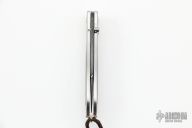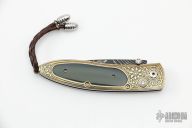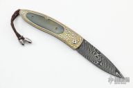 This B05 Venice by William Henry features a Damascus blade with single thumbstud with diamond inlaid in gold bezel. The handle has a stainless steel frame with Koftgari inlaid 24kt gold, water buffalo horn inlays, lanyard bail with braided leather lanyard. Comes with original box, sheath and papers. Excellent condition. #165-0168