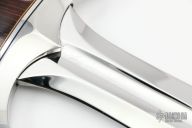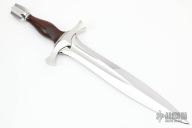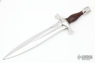 This "Classic Short Sword" by Rod Chappel features a mirror polished double edged blade with fullers, .361" blade stock and 2.150" blade depth, hidden tang construction. The handle has a mirror polished stainless steel guard cocobolo grip, stainless steel butt, black/aluminum/red/brass spacers. Has a few light scratches, but overall excellent condition. This thing is ridiculous!