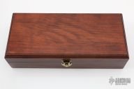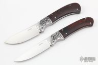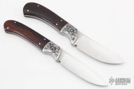 These Hunters by Ron Gaston both feature drop point satin finished blades with a tapered tang construction. Skinner: .187" Blade Stock, 1.005" Blade Depth.  Hunter: .153" Blade Stock, .836"Blade Depth.  The handles have engraved steel bolsters and wood scales.  Includes a felt lined display case.  Excellent Condition.