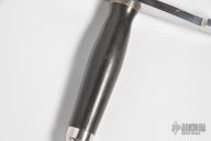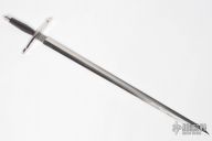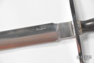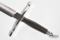 This Sword by Pat Crawford features a satin finished double edged blade with .245" blade stock and 1.496" blade depth, hidden tang construction. The handle has a nickel silver guard and butt with a black wood grip. The handle has a crack running the length of the grip. Has a few light scratches, otherwise excellent condition.