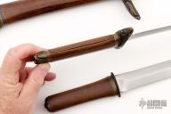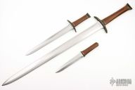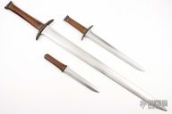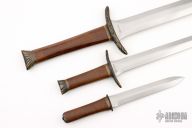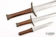 This Set by Bob Terzuola is one of a kind and totally unlike anything he makes! It features a sword, short sword and dagger. All the blades are hand rub satin finished, carved bronze fittings and 2-piece walnut grips, hidden/mortise tang construction. The wood on the two smaller knives has warped slightly creating a gap between the slabs. Otheriwse the set is in excellent condition.