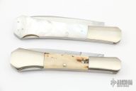 The first folder features a hand rub satin finished blade with false top edge. The handle has nickel silver bolsters, mother of pearl scales, nickel silver liners, stainless steel and mother of pearl backspacer. Nice lockup and blade seating. Has some light scratches, otherwise excellent condition. #002 on the blade.