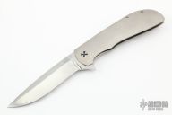 This Seeker flipper by Michael J Smith features a hand rub satin finished blade with false top edge and flipper. The handle has orange peel finished titanium scales, orange peel finished titanium tip up clip with hidden screws. Nice detent, lockup and blade seating, rides on bearings. Excellent condition. Comes with zippered case.