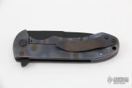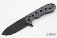 This Framelock Flipper by Michael Burch features a black blade with a notched thumbrest and flipper. The handle has a flame anodized titanium frame over a G-10 backspacer. Flame anodized titanium tip up clip. Nice detent, lockup and blade seating. Has some scuffs, otherwise good condition.