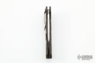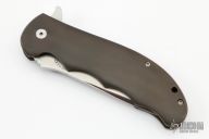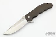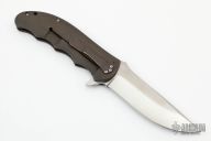 This frame lock flipper features a hand rubbed satin finish blade with notched thumbrest and a flipper. Anodized titanium frame and pocket clip. Flipping that requires no wrist action. Strong lock up, nice detent and blade seating is dead center. Very nice work. Numbered "01" on blade spine. Includes a zippered case. Has a couple light scuffs, otherwise excellent condition.