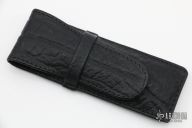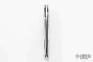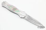 This Linerlock folder by Ron Best features a Damacus blade with false top edge and nail nick, has carved in fullers. The handle has a carved and mirror polished stainless steel blade with black lip pearl inlays. Nice detent and lockup. Comes with a leather pouch. Excellent condition.