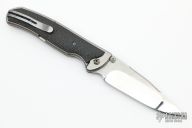 This Fire D/A by Matt Diskin is a very smooth action scale release double action. Mirror and tumble finished multiground blade with dual thumbstuds. The handle has a tumble finish titanium frame with carbon fiber scales and lightning strike carbon fiber backspacer, tip up stainless steel clip. Firing is very smooth and fast, strong lock up, nice detent. Includes a nylon sheath. Light scratches are visible on the blade otherwise the knife is in excellent condition.