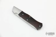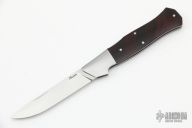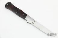 This knife by Larry Newton features a hand rub satin finished blade with a nail nick. The handle has satin finished stainless steel bolsters with integral liners, ironwood scales, stainless steel backspacer. Nice lockup and blade seating. Has a few light scratches, otherwise excellent condition.
