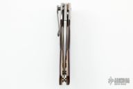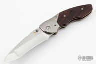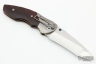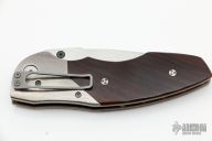 This custom Scout linerlock by Allen Elishewitz features a tumbled blade with a single thumbstud. The handle has orange peel finished titanium bolsters, cocobolo scales, textured and anodized titanium liners, barrel spacers, and a tip down bead blasted stainless steel clip. Gold Elishewitz logo medallion. Nice blade seating, detent, and lockup. Has some scratches on the clip, otherwise excellent condition.