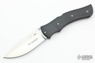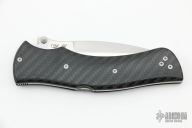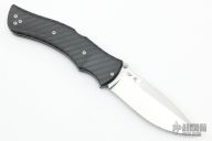 This knife features a satin finished blade with a false top edge, dual thumbstuds and a notched thumbrest.  The handle features carbon fiber scales over steel liners.  Light scuffs are visible on the blade otherwise the knife is in excellent condition.