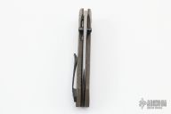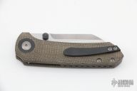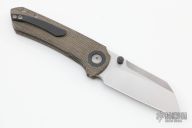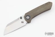 This Maverick S by Matthew Christensen features a satin finished blade with dual zirconium thumbstuds. The handle has a green canvas micarta frame, inlaid titanium liner, zirconium pivot collars, backspacer and tip up clip. Comes with original cloth case. Excellent condition.