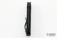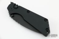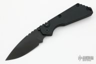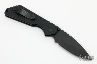 This Pro-Strider SNG by Pro-Tech and Strider Knives features a black blade with notched thumbrest. The handle has a black aluminum frame with black hardware and black stainless steel tip up clip.  There is a tritium lantern inlaid into the push button. #11 of 50. The pocket clip is distressed otherwise the knife is in excellent condition.