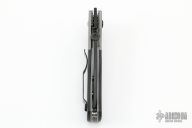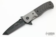 This PoBoy CQC-7 Folder from Emerson features a black chisel ground tanto blade with bead blast dovetailed titanium bolsters, carbon fiber scales, bead blast titanium liners, tip up stainless steel clip.  Thumb Disc, wave feature, notched thumbrest. Nice detent, lockup and blade seating. Includes original box and papers.  Includes original G10 scales.  Excellent Condition.