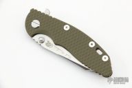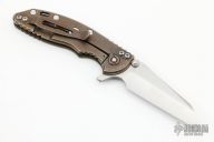 This Custom XM-18 by Rick Hinderer features a satin finished wharncliffe blade with notched thumbrest and flipper. The handle has a green G-10, bronzed titanium frame and clip, lanyard hole at the butt. Nice detent, lockup and blade seating.  Includes the original box. Excellent condition.