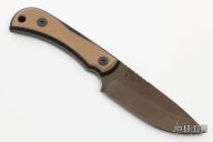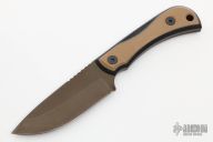 This Cav Jr by Half Face Blades features a bronze coated blade with a notched thumbrest, .150" blade stock, 1.250" blade depth, full tang construction.  The handle has tan/black G-10 scales.  Comes with a kydex sheath with clip. Excellent condition.