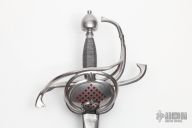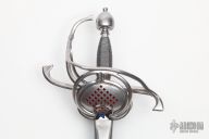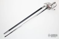 This Pappenheimer Rapier by Hanwei features a mirror polished blade with unsharpened edged, .216" blade stock and .945" blade depth, hidden tang construction. The handle has a stainless steel guard and wire wrapped grip. Comes with original scabbard. Has some scratches, otherwise excellent condition.
