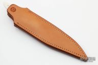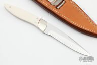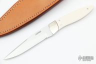This boot knife by Harold Corby features a mirror polished blade with a false top edge, .084" blade stock and .825" blade depth, full tang construction. The handle has nickel silver dovetailed bolsters, mammoth ivory scales with red liners. Comes with a brown leather boot sheath. Excellent condition.