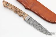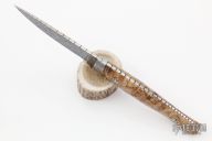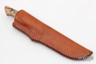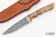 This knife by James Largent features a Damascus blade with fileworked blade spine, .105" blade stock and 1" blade depth, full tapered tang construction. The handle has satin finished dovetailed stainless steel bolsters that have been engraved, spalted burl wood scales and mosaic pins, the tang is fully fileworked Comes with a brown leather sheath. Excellent condition.
