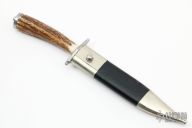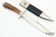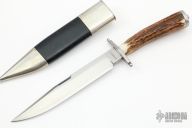 This Gentleman's Bowie by Chuck Roberts features a hand rub satin finished blade with a nearly sharpened top, .194" blade stock and .921" blade depth, hidden tang construction. The handle has a stainless steel guard, stag grip, and a stainless steel butt. Comes with a nickel silver and black leather sheath. Has a few light scratches, otherwise excellent condition.