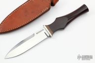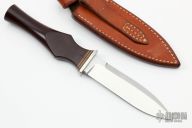 This Dagger by Morseth Knives features a high polished blade with a sharpened top edge and a hidden tang construction.  .184" Blade Stock.  .922" Blade Depth.  The handle features a nickel silver guard and a micarta grip.  Includes a brown leather sheath.  Scratches are visible on the blade and handle otherwise the knife is in excellent condition given its age.