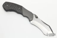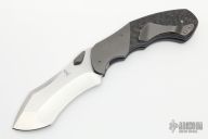 This Minion folder from Jeremy Marsh features a hand rub satin finished blade with dual thumbstuds. The handle has bead blasted and dovetailed titanium bolsters, carbon fiber scales, anodized and blasted titanium liners, tip up titanium pocket clip set up for left handed carry, but the knife is a right handed lock. Nice detent, lockup and blade seating. Has a few scuffs and scratches, otherwise excellent condition. Comes with a zippered case.