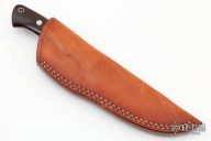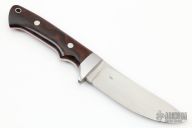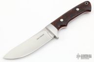 This Skinner by Claude Montjoy features a hand rubbed satin finish blade with .202" stock 1.141" blade depth, full tapered tang construction. The handle has a stainless steel bolsters, burl scales over red liners. Comes with a brown leather. This knife is marked "Baker & Montjoy" we are not sure who Baker is.  Marked 001.  Excellent condition.
