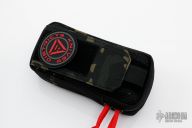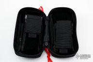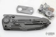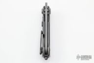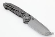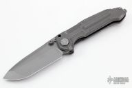This Frame lock Flipper by District 9 has a stonewashed M390 drop point blade with dual thumb studs, flipper, and filed thumb rest. Handle is stonewashed titanium with stainless steel lock bar insert, manual lock safe system (preventing the lock bar from sliding to the open position, making this knife a virtual fixed blade), stonewashed titanium backspacer and tip up clip, and lanyard hole. This is an impressive piece with superb ergonomics and mechanics. Flips like a champ on caged bearings, dead center blade seating and rock solid lockup. Very nice work. Excellent condition. Comes with zippered case and extra hardware.
