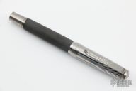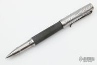 Solid Titanium with Uni Carbon Fiber body overlay, with Ripple Damasteel Stainless Steel Damascus cap overlay. Roller Ball Pen. New from maker. Takes a Schmidt refill.