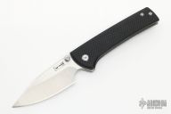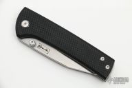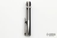 This Chaves Scapegoat features a satin finished drop point blade with the Chaves logo and dual thumbstuds. The handle is composed of black G-10 and stonewashed titanium with a matching tip up titanium pocket clip.  Includes an interchangeable titanium pocket clip. Has a couple light scuffs otherwise excellent condition.