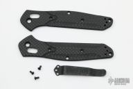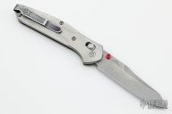 The Warren Osborne designed Benchmade 940 is a popular knife for good reason. It's a comfortable everyday carry knife with its slim design, great ergonomics and lightweight. The 940-1 has a premium CPM-S90V steel blade with a plain edge and a stonewashed finish. The handle has custom Death Grip titanium scales, stainless steel liners and blue anodized aluminum barrel spacers. The AXIS lock makes the knife usable for right and left-handers. Comes with original box, carbon fiber scales and papers. Excellent condition.