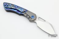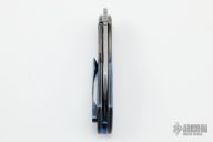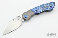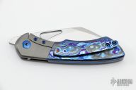 This Whippersnapper from Olamic Cutlery features a satin finished blade, thumbhole, notched thumbrest and front flipper. The titanium frame has a black timascus inlays and pocket clip is positioned for tip up carry, floating titanium backspacer. Blade is centered when closed and locks up with no play. Comes with maker's card with a serial number of WSBL034-S and dated 06/30/2022. Includes a padded zippered case. Excellent condition.