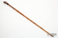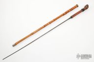 This antique sword cane features a carbon steel fluted blade. The cane is made from bamboo and the handle is a peice of some kind of burl wood. Has some patina and scratches, but overall good condition for its age. NOTE: the closed length will refer to the length when the sword is sheathed in the cane. The overall length is just that of the sword and handle.
