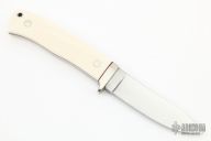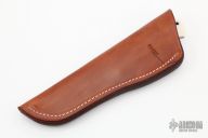 This knife by Harold Corby features a satin finished drop point blade with a tapered tang construction.  .165" Blade Stock.  .897" Blade Depth.  The handle features a nickel silver guard with interior mammoth scales over red liners.  Includes a brown leather sheath.  Excellent Condition.