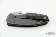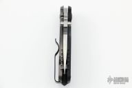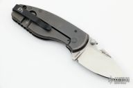 This HEAT/ F Plain Edge Framelock Folder has an acid etched drop point blade with dual thumb studs, bottle opener, and a notched thumbrest. Handle is black G10 and gunmetal titanium, with a matching stainless steel tip up clip and removable glass breaker, lanyard hole. Comes with original packaging. Excellent condition.