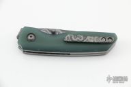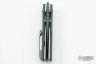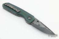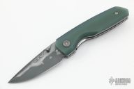 This Nevada Jr. by Chad Nell features a Bull Dog San Mai Damascus blade with 80CRV2 core, false top edge, dual thumbstuds, and notched front flipper. The handle has jade G-10 scales with black liners, Lava Lamp Black Timascus inlay in pivot, titanium pivot collars, Lava Lamp Black Timascus backspacer and tip up clip. Rides on bearings, nice detent, lockup and blade seating. Comes with zippered case and COA dated 7/22. New from maker!