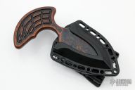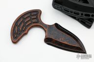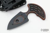This Sleight push dagger by Heretic Knives features a chisel ground double edged Battleworn Black blade that is attached to a Breakthrough Bronze finished aluminum handle. Overall thickness is .350" and has a blade depth of 1.680". Comes with a molded polymer sheath with TekLok. Comes with original box and papers. New from maker.