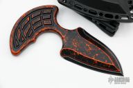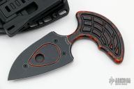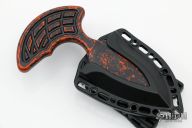 This Sleight push dagger by Heretic Knives features a chisel ground double edged Battleworn Black blade that is attached to a Breakthrough Orange finished aluminum handle. Overall thickness is .350" and has a blade depth of 1.680". Comes with a molded polymer sheath with TekLok. Comes with original box and papers. New from maker.