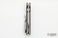 This K2 Linerlock Flipper by Korth Cutlery features a stonewashed blade with notched thumbrest and flipper. The handle has micarta scales, orange peel finished titanium liners, backspacer and tip up clip. Includes IKBS (Ikoma-Korth Bearing System) for smooth and fast opening that requires no wrist action. Nice detent, blade seating, and lockup. Knife comes with original Velcro sheath. Excellent Condition.