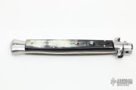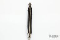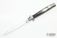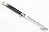 This Swivel Bolster from Stiletto Italy features a kris ground blade with false top edge. The handle is comprised of stainless steel bolsters and pommel with buffalo horn scales over brass liners and stainless steel backspacer. Excellent condition.