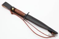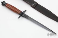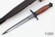 This is a copy of the famous Case V42 dagger made for the First Special Service Force [ FSSF ] the famous " Devil's Brigade " during World War Two. It is made by H.G. Long & Co. of Sheffield, England and sold by the EK Commando Knife Company. Has a black double edged blade with .181" blade stock and .742" blade depth, hidden tang construction. The handle has a black guard and butt with stacked leather and brass grip. Comes with original brown leather sheath, box and papers. Excellent condition.